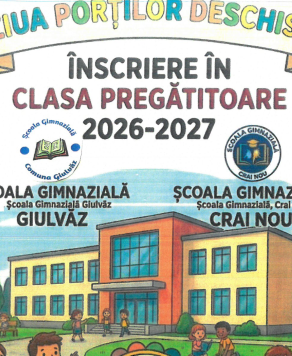 Ziua porților deschise la Școală Giulvaz.Mai jos detalii pentru inscrierea în clasa pregătitoare pentru anul școlar 2026-2027.Descarcă: Descarcă metologie înscriere învățământ primar: Mai jos calendar înscriere CP 2026-2027: Vă așteptăm!